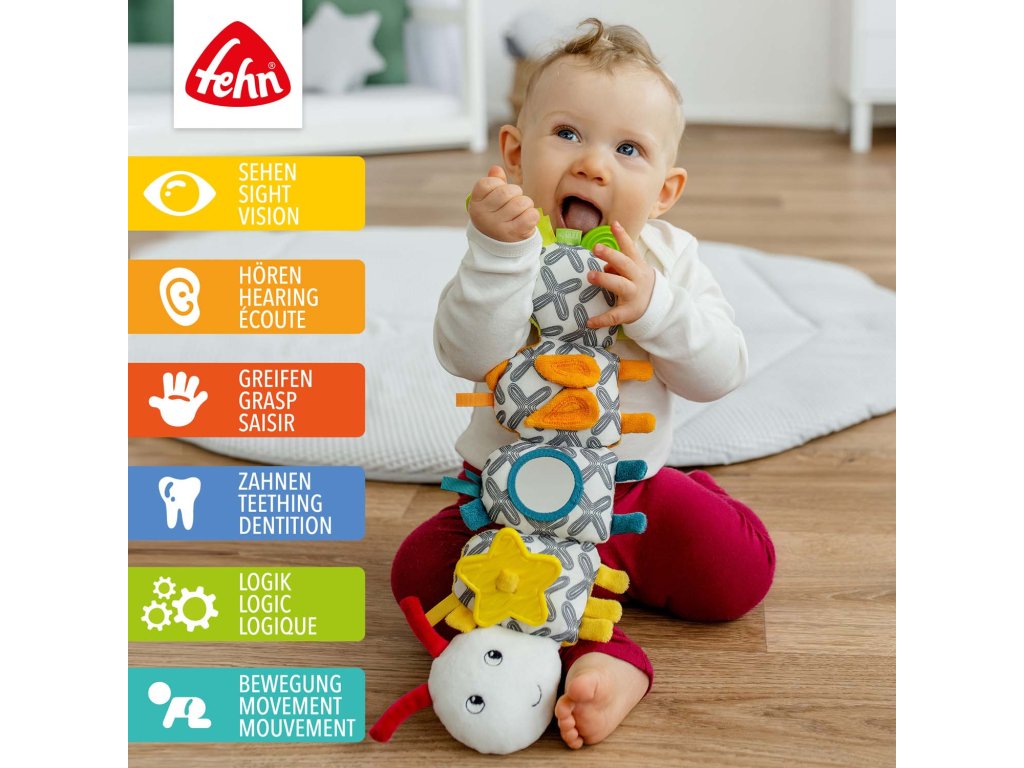 Rozmanitosť použitých materiálov a bohaté herné možnosti húsenice s pohyblivými časťami navyše podporujú rozvoj hmatových schopností. Výrazná čiernobiela látka v kombinácii s farebnými akcentmi a množstvom interaktívnych prvkov z nej okamžite spraví obľúbeného spoločníka každého bábätka.