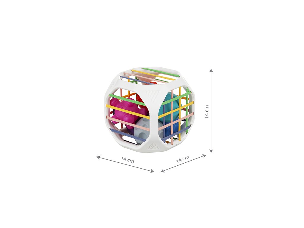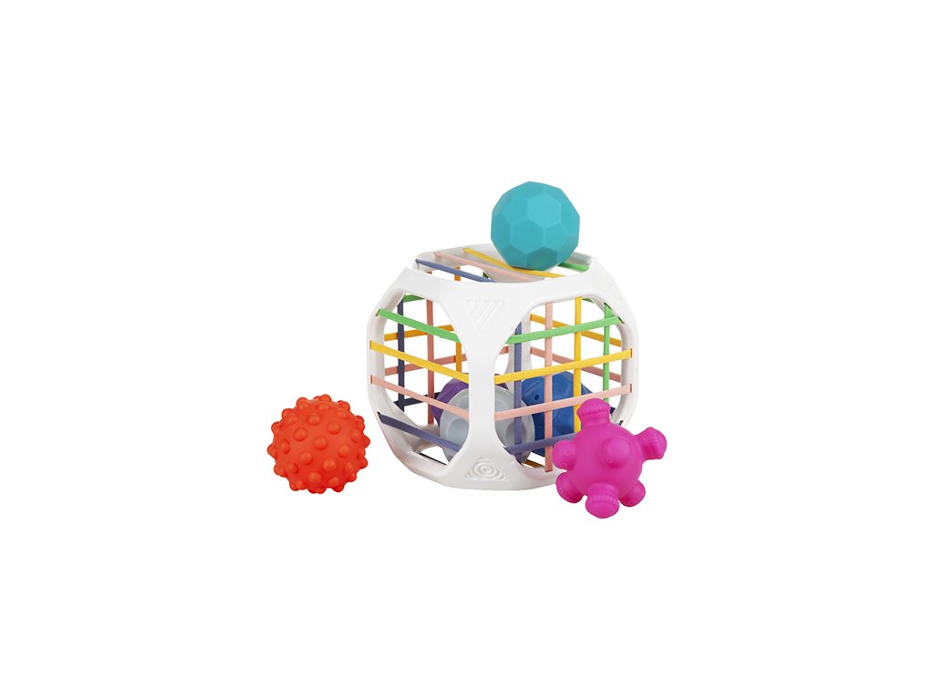 - Tvar, veľkosť a hmotnosť boli starostlivo prispôsobené tak, aby dokonale zodpovedali manuálnym potrebám dieťatka. Kocka pomáha dieťatku naučiť sa chytiť a držať, zatiaľ čo loptičky pohybovať prstami.