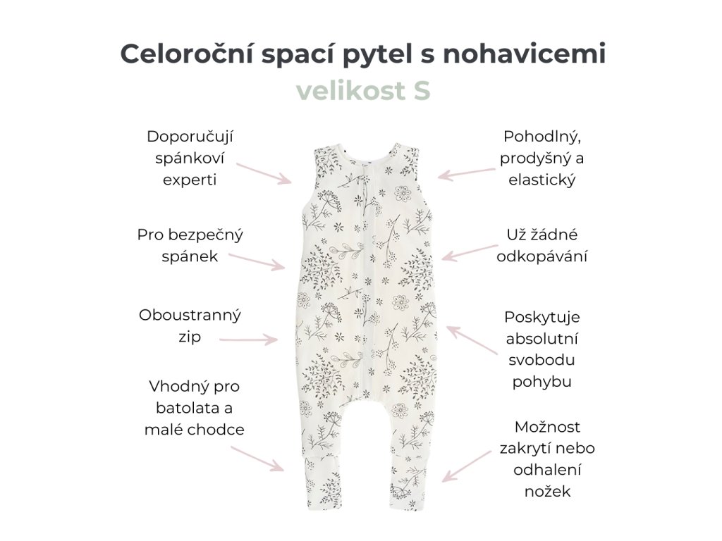 Nohavice mají zakončení stejné, jako u některých dětských bodyček a overalů - okraji nohavic tak můžete jednoduše překrýt nožky dítěte a zajistit jim ještě větší teplo. Nohavičky můžete překrýt až v průběhu spánku podle toho, zda je dítěti teplo nebo zima.