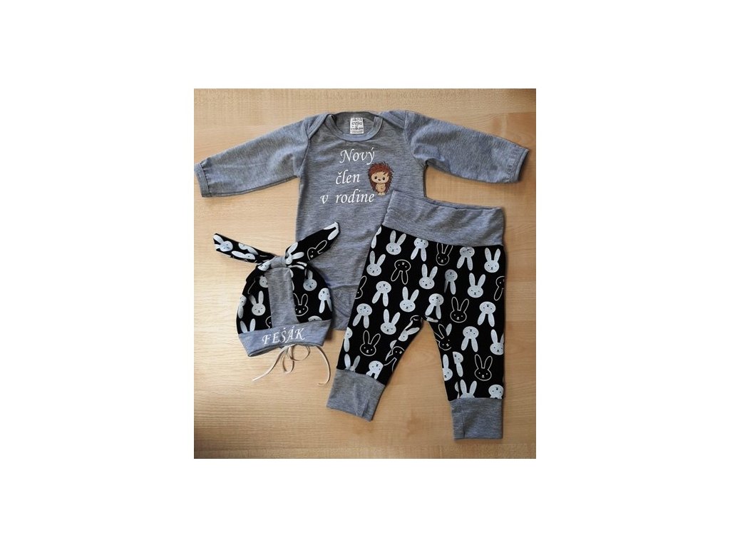 Chlapčenská kojenecká súprava s nápisom, zloženie 95% bavlna, 5% elastan. Súprava sa skladá z čiapočky, body dlhý rukáv a tepláčiky. Každá veľkosť má iný obrázok, ktorý sa zobrazí pri označení požadovanej veľkosti. Veľkosti: 68,74,80. Vyrobené na Slovensku.
