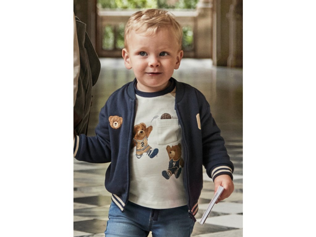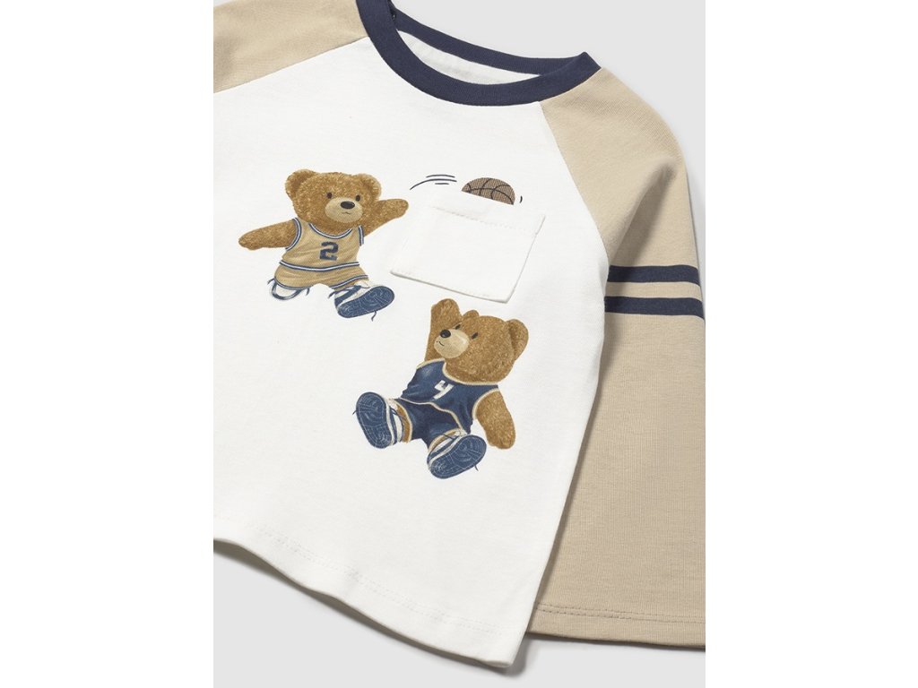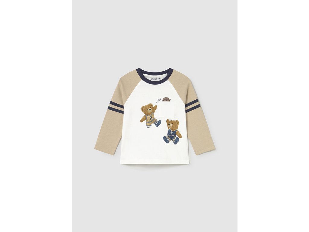 Detské tričko s dlhým rukávom. Okrúhly výstrih. Dekoratívne prvky: ozdobné vrecko, sieťotlač.