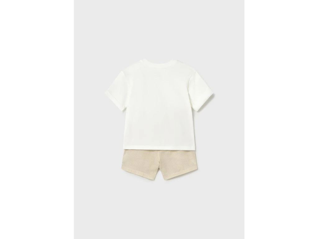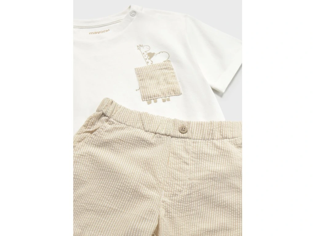 Súprava trička a šortiek pre chlapčeka. Tričko je vyrobené z bavlny, má krátke rukávy a okrúhly výstrih a zapínanie na gombík na ramene pre jednoduché obliekanie. Vpredu má potlačený dizajn. Šortky sú vyrobené z bavlnenej látky s pruhovaným vzorom.