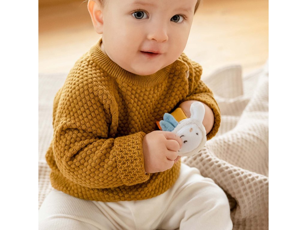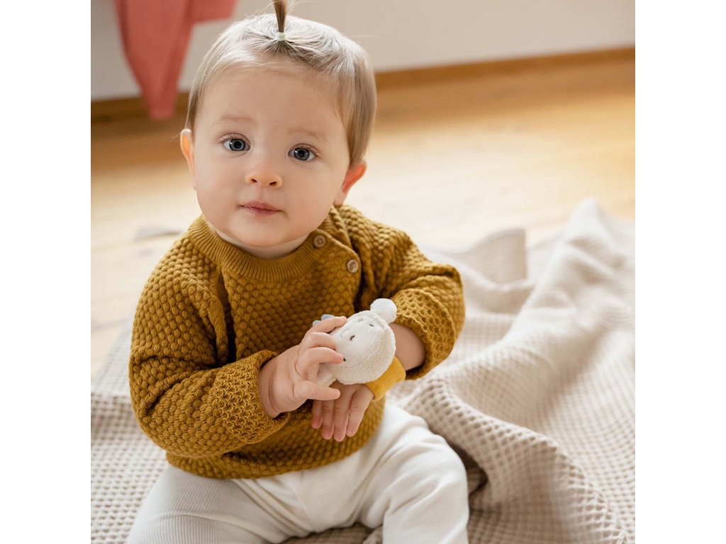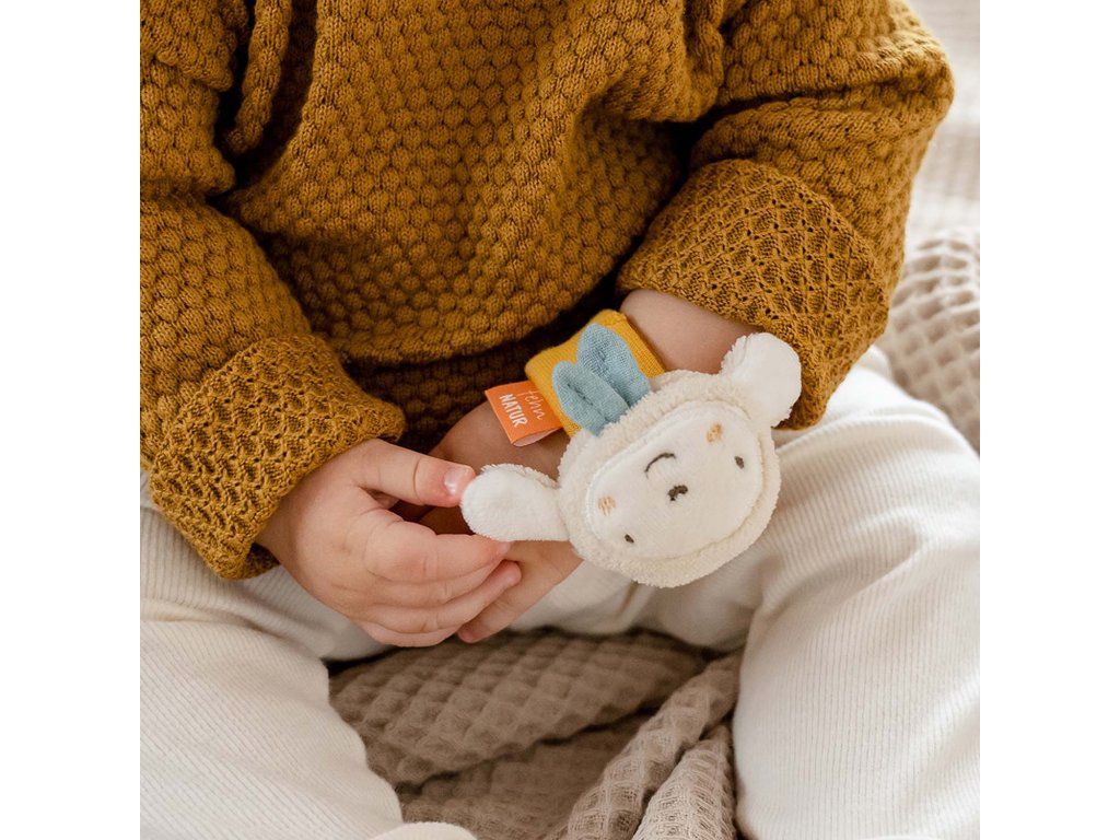 Ľahko sa nasadzuje na ručičku, pri pohybe dieťatka – trasenie ručičkami vydáva fascinujúce zvuky, ktoré malé deti milujú. Hrkajúci náramok hravou formou podporuje sluch, úchop a hmat bábätka aj jemnú motoriku.