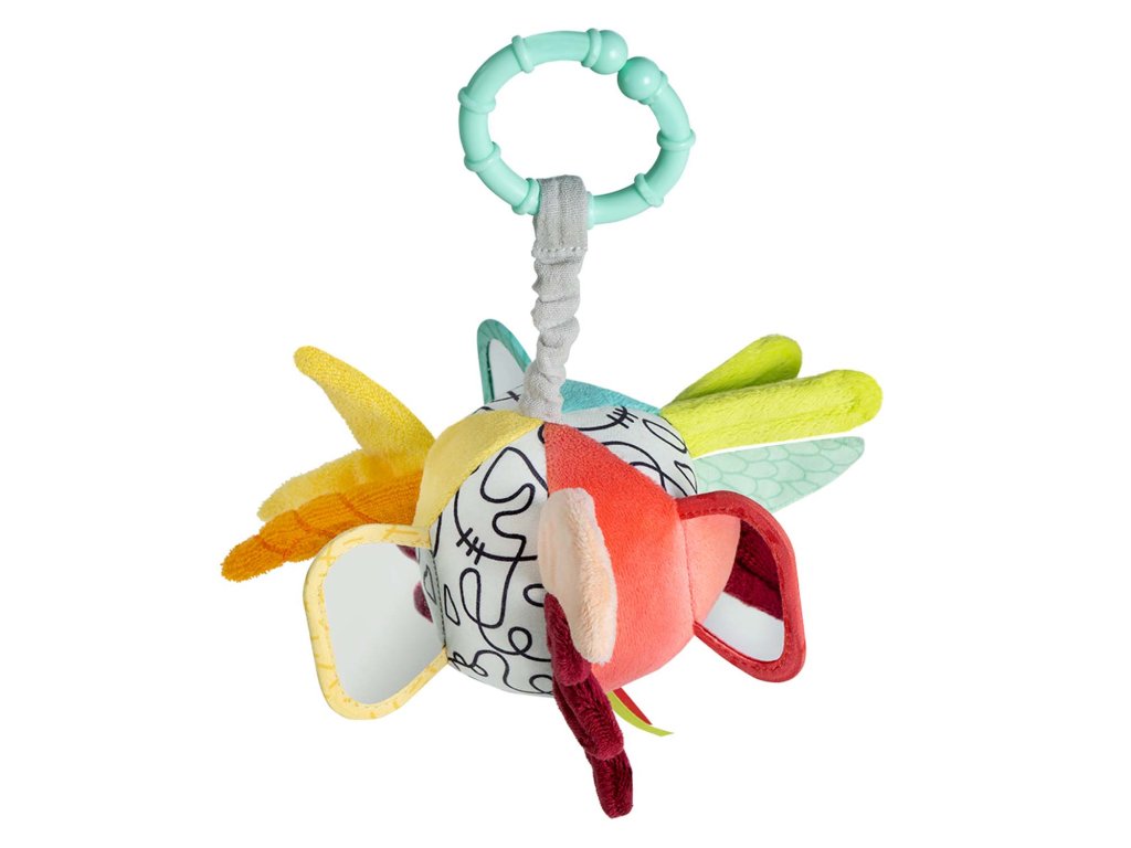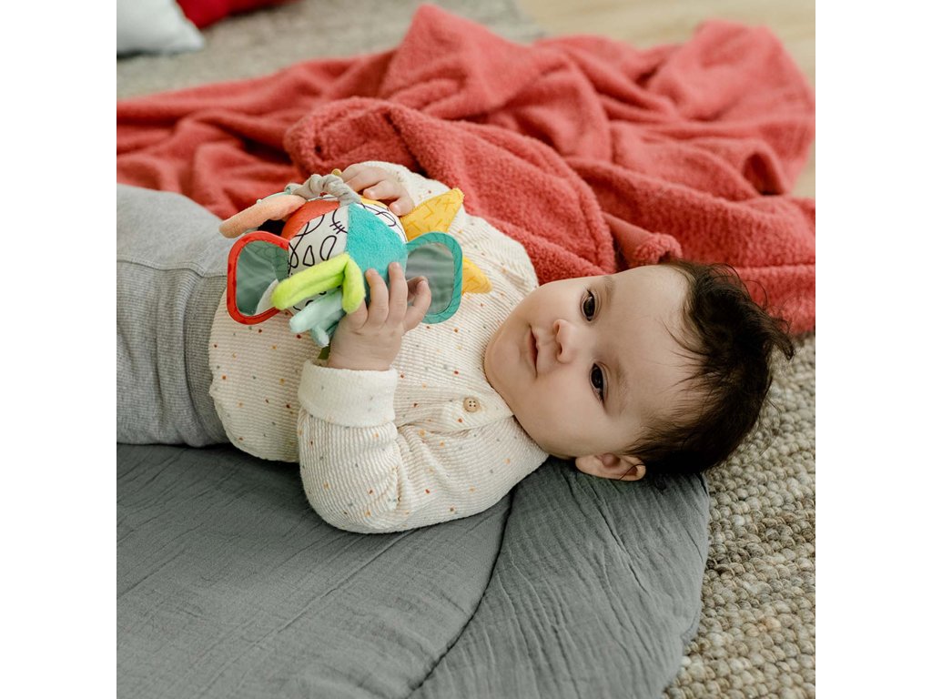 Farebná, vysoko kontrastná látková lopta hravo podporuje rozvoj zmyslov: podporuje zmysel pre zrak, sluch, obratnosť, koordináciu rúk a očí, motoriku a logické myslenie. Deti si túto hračku rýchlo obľúbia a vďaka praktickej veľkosti a upevňovaciemu krúžku si ju môžu vziať všade – či už doma v postieľke alebo na cestách, v autosedačke alebo v kočíku.