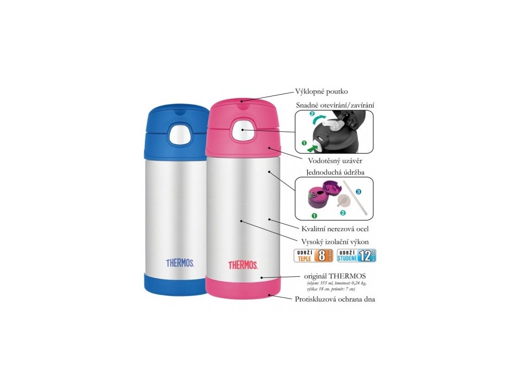 Praktický dizajn uzáveru a pítka termosky umožňuje kompletné a jednoduché umytie. 1 - uzáver termosky, 2 - fontánka s pitnou vodou, 3 - slamku. Dno termosky je spoľahlivo chránené odolnou plastovou pätkou, ktorá zároveň pôsobí protišmykovo. parametre termoskyObjem: 355 mlVýška: 180 mmPriemer: 70 mmPriemer hrdla: 50 mmHmotnosť: 220 gUdrží horúce: Nie je určené pre horúce (vriacej) nápoje - môže dôjsť k obareniuUdrží teplé: 8 hodínUdrží studené: 12 hodín súhrnIdeálne pre školské a predškolské detiOtvorenie a uzavretie termofľaše jednou rukouPitie priamo z ergonomického napájadielka / slamky termofľaše - bez hrnčekaIntegrované výklopné pútko vo viečku termosky.Navrhnuté pre každodenné použitie, dobre padne do ruky či držiaka nápojov v auteNavrhnuté pre deti - telo termofľaše vyrobené z odolnej nerezovej ocele spomaľujúci rast baktériíThermos dvojstenná vákuová izolácia - maximálna tepelná izoláciaĽahké a kompaktné prevedenie, ľahko sa vojde do batohu alebo kočíkavodotesný uzáverRozoberateľný uzáver pre jednoduché čistenieKompletná ponuka náhradných dielov.