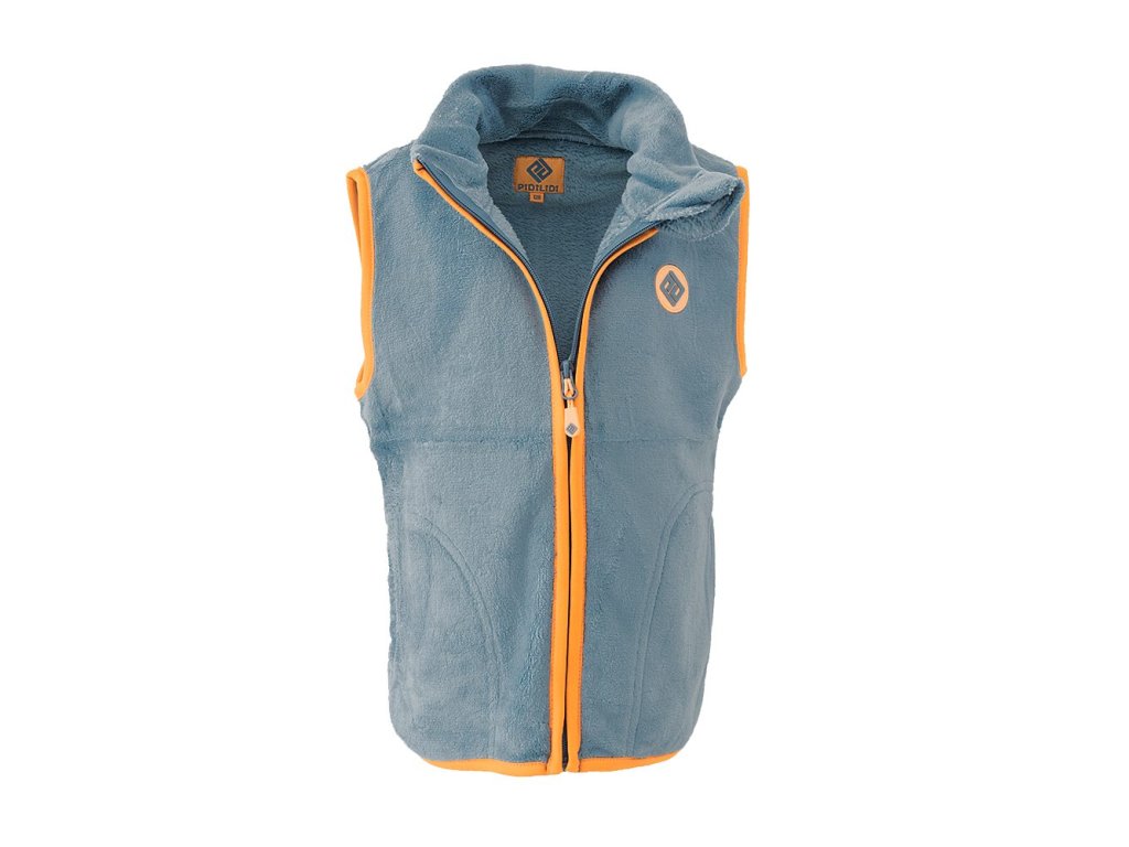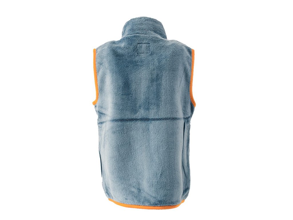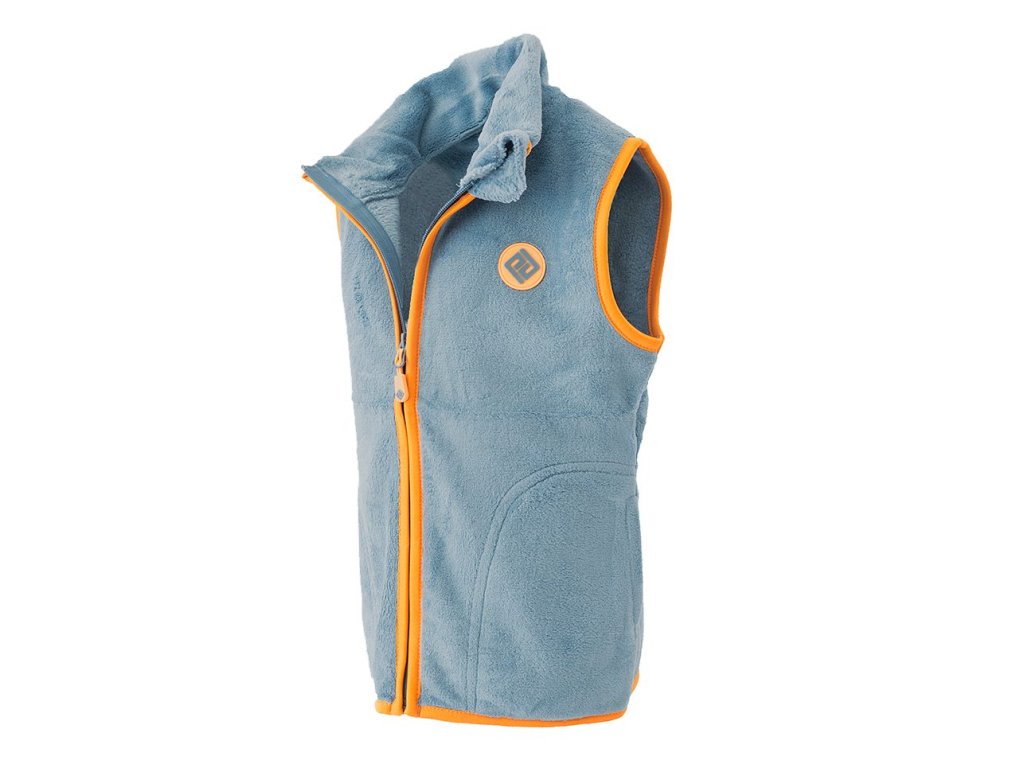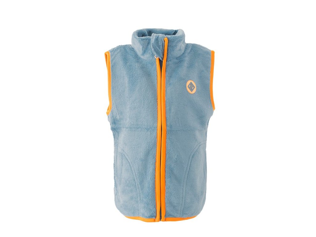 Detská chlpatá vesta v modrej farbe. Stojatý golier, dve vrecká, kontrastné farebné lemy.
