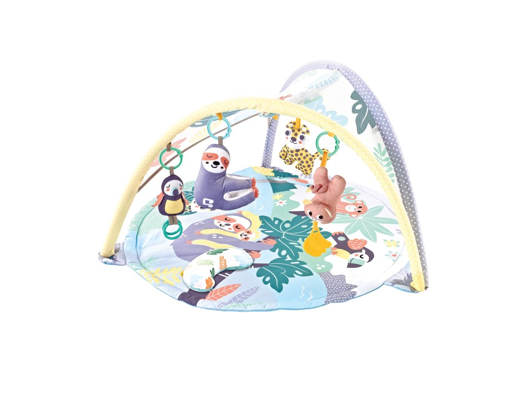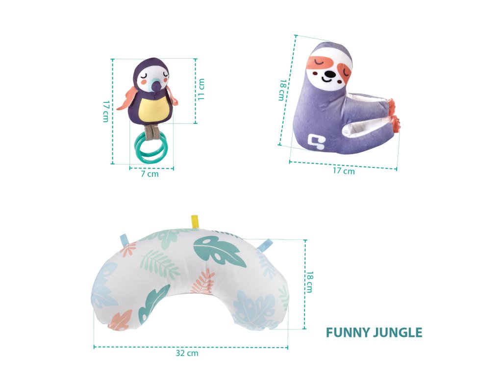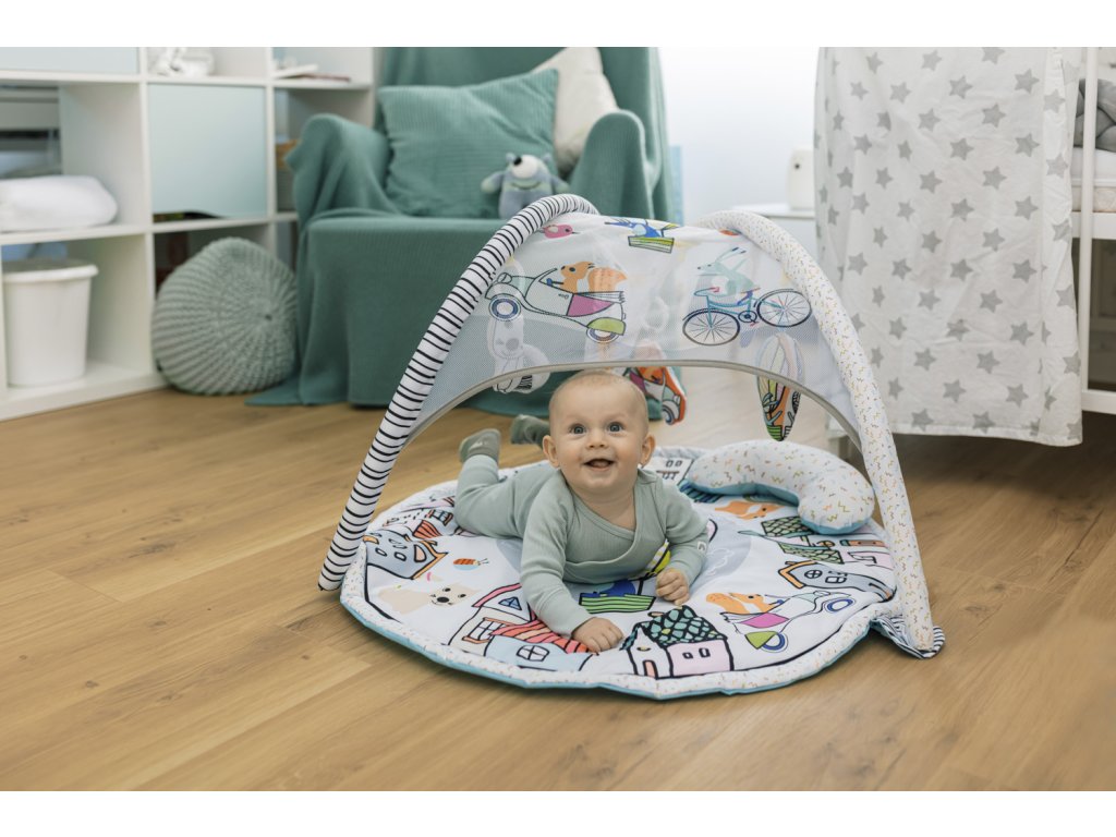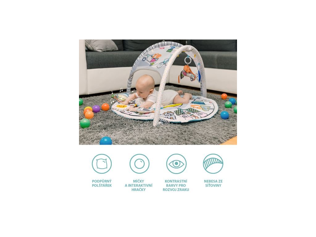 Súčasťou podložky na aktivity je tvarovaný vankúšik, ktorý sa stane skvelým pomocníkom na pasenie koníčkuů. Vďaka tomu deti dostanú potrebnú podporu. Závesné hračky je možné pripevniť na vankúšik, vďaka pútkam bábätku nikam neutečú, motivujú bábätko k správnemu držaniu tela. Neskôr vankúšik využijete aj pri nácviku plazenia, keď ho dáte bábätku pod bruško.