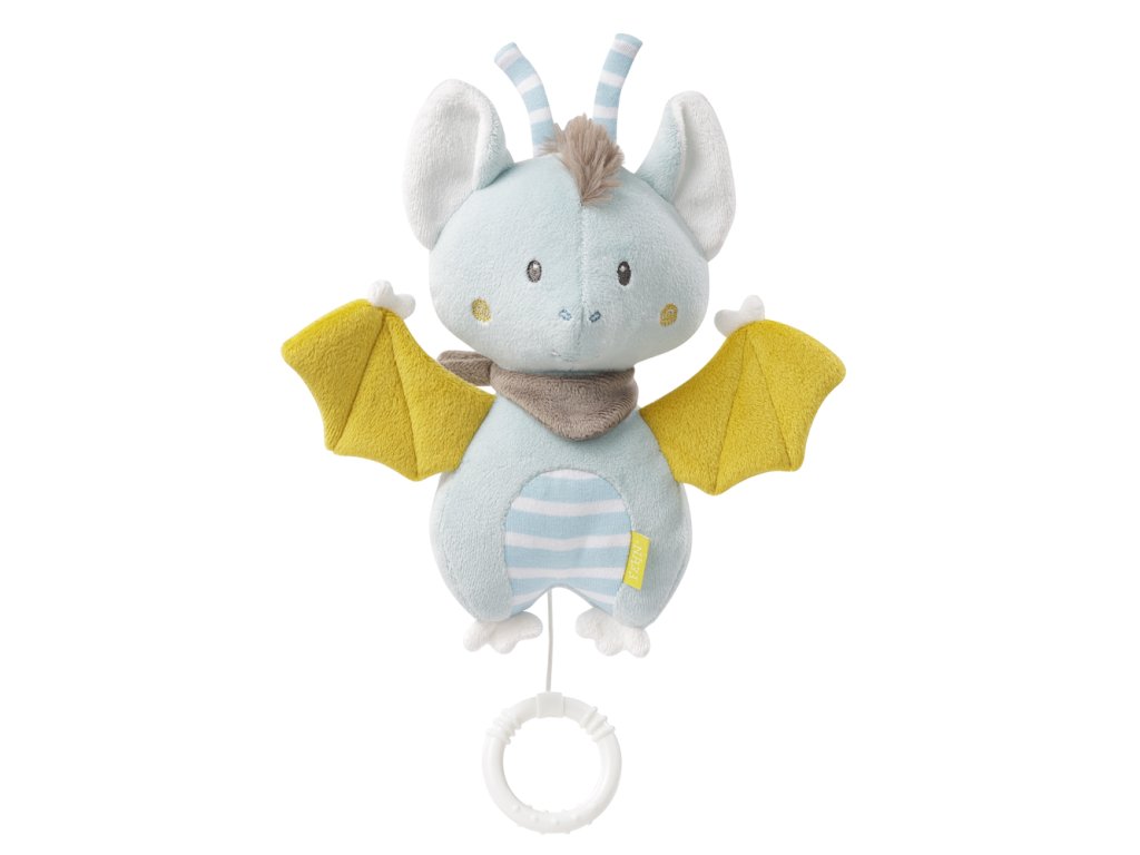 Malý hudobný box v tvare netopiera s vyberateľným hudobným mechanizmom. Hračka je vyrobená z mäkkých, príjemných materiálov, ktoré nabádajú k dotyku a maznanie. Netopier má na chrbte zips, ktorým môžete vybrať hrací strojček. V spodnej časti hračky je šnúrka s krúžkom, ktorý sa ľahko ovláda. Zatiahnutím spustíte uspávanku. Netopier sa dá ľahko pripevniť pomocou viazacích šnúrok.
