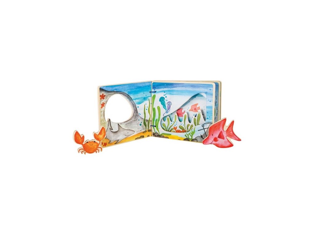 Vďaka tejto interaktívnej obrázkovej knihe vyrobenej zo 100% certifikovaného dreva FSC® môžu deti hravo objaviť podvodný morský svet. Krabi a ryby sa potápajú otvormi na farebne navrhnutých stránkach, dokážu znovu a znovu vyvolať fantáziu.