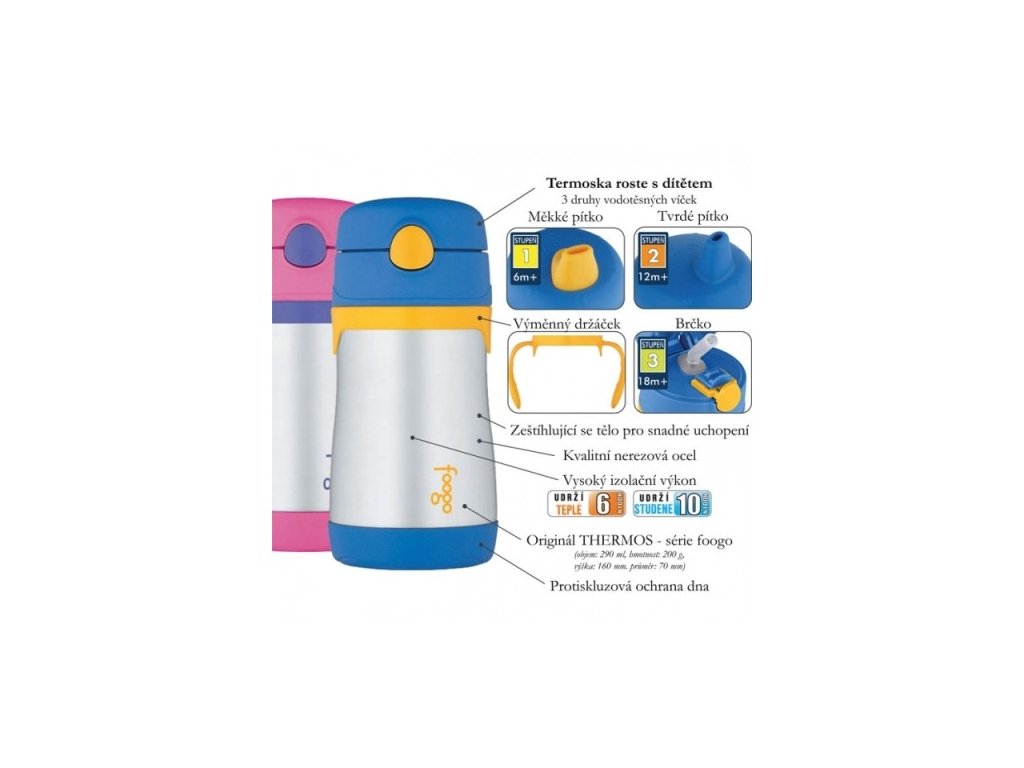 parametre termosky Objem: 290 mlVýška: 160 mmPriemer: 70 mm (pri použití držiaka 115 mm)Priemer hrdla: 50 mmHmotnosť: 180 g - 200 g (podľa použitého pítka)Udrží horúce: Nie je určené pre horúce (vriacej) nápoje - môže dôjsť k obareniuUdrží teplé: 6 hodínUdrží studené: 10 hodín súhrnTermofľaša Foogo sa jednoducho adaptuje na potreby dieťaťa - rastie s ním.Thermos dvojstenná vákuová izolácia - maximálna tepelná izolácia.Navrhnuté pre deti - telo termofľaše vyrobené z odolnej nerezovej ocele spomaľujúci rast baktérií.Pitie priamo z slamky termofľaše - bez hrnčeka.Možno použiť aj s ergonomickým držiakom.Vodotesný uzáver.Ľahké a kompaktné prevedenie, ľahko sa vojde do batohu, kočíka či držiaka nápojov v aute.Navrhnuté pre každodenné použitie - dobre padne do detskej rúčky.Ľahko umývateľné, vhodné do umývačky.Kompletná ponuka náhradných dielov.