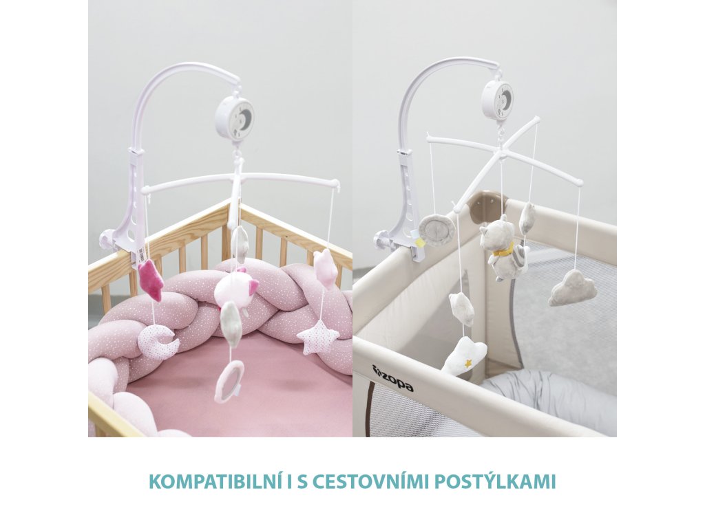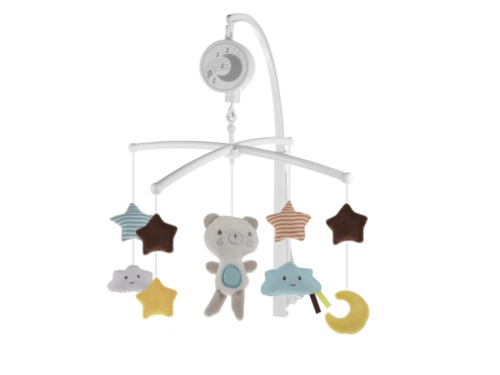 Rozpohybované plyšové hračky v jemných farbách prírodných motívov, ktorým dominuje roztomilé zvieratko, sprevádza niekoľko príjemne sladkých melódií. To všetko u dieťatka podporuje sluchové, motorické a vizuálne vnemy. V jeho postieľke sa tak navodí príjemná atmosféra, ktorá dieťatko ľahko upokojí a jemne zavedie až do ríše snov.