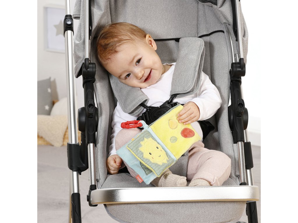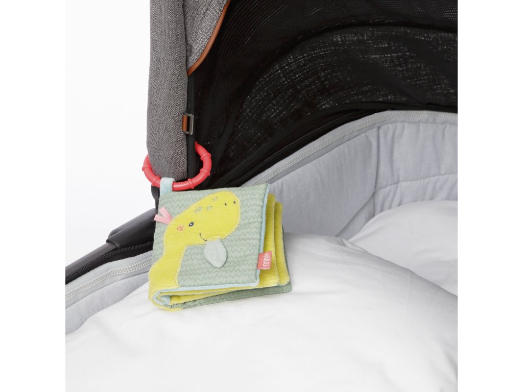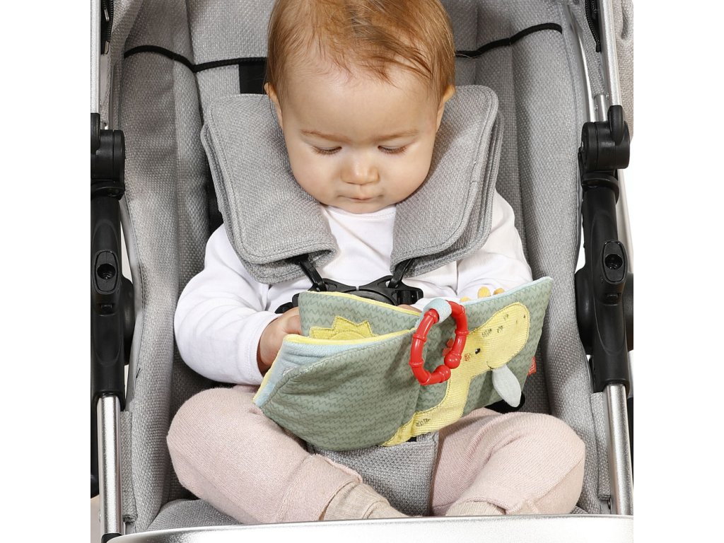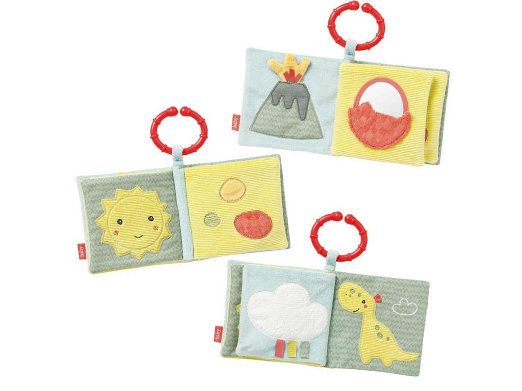 S látkovou plyšovou knižkou môžu deti na 8 stranách oživiť roztomilé praveké stvorenia. Každá stránka má rôzne zábavné efekty ako sú pískadlo , šuštiaci papier, plyšové vajíčka či zrkadlo . Knižka rozvíja úchop, hmat, fantáziu a jemnú motoriku . Praktický upevňovací krúžok dovoľuje ľahké pripevnenie na postieľku, kočíku alebo autosedačku.
