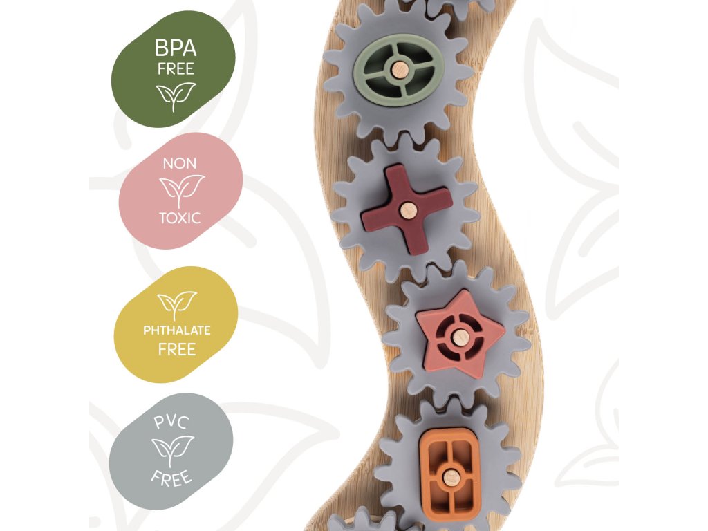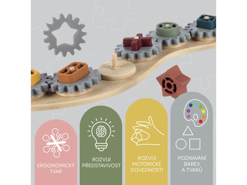 Objavte kúzlo učenia s našou bambusovo-silikónovou skladačkou, ktorá prepája zábavu s poznaním. Farebné ozubené kolieska rozvíjajú jemnú motoriku, logické myslenie a predstavivosť vášho dieťaťa. Kombinácia prírodného bambusu a bezpečného silikónu poskytuje príjemný senzorický zážitok a podporuje prirodzené objavovanie sveta mechaniky.
