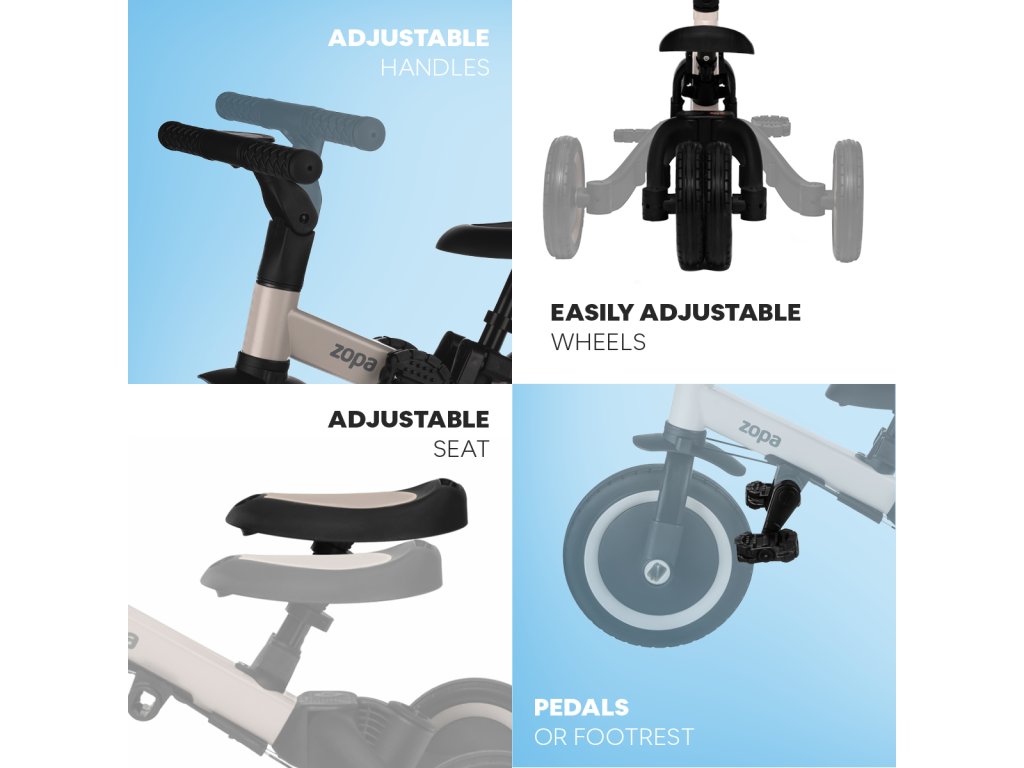 Vďaka šikovnej konštrukcii je možné jednotlivé časti ľahko odobrať alebo prestavať – bez potreby náradia. Prechod z trojkolky na odrážadlo či bicykel je otázkou niekoľkých minút. Trojkolka má navyše kompaktné rozmery, takže sa bez problémov zmestí do kufra auta a je vhodná aj na cestovanie.