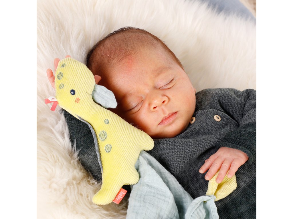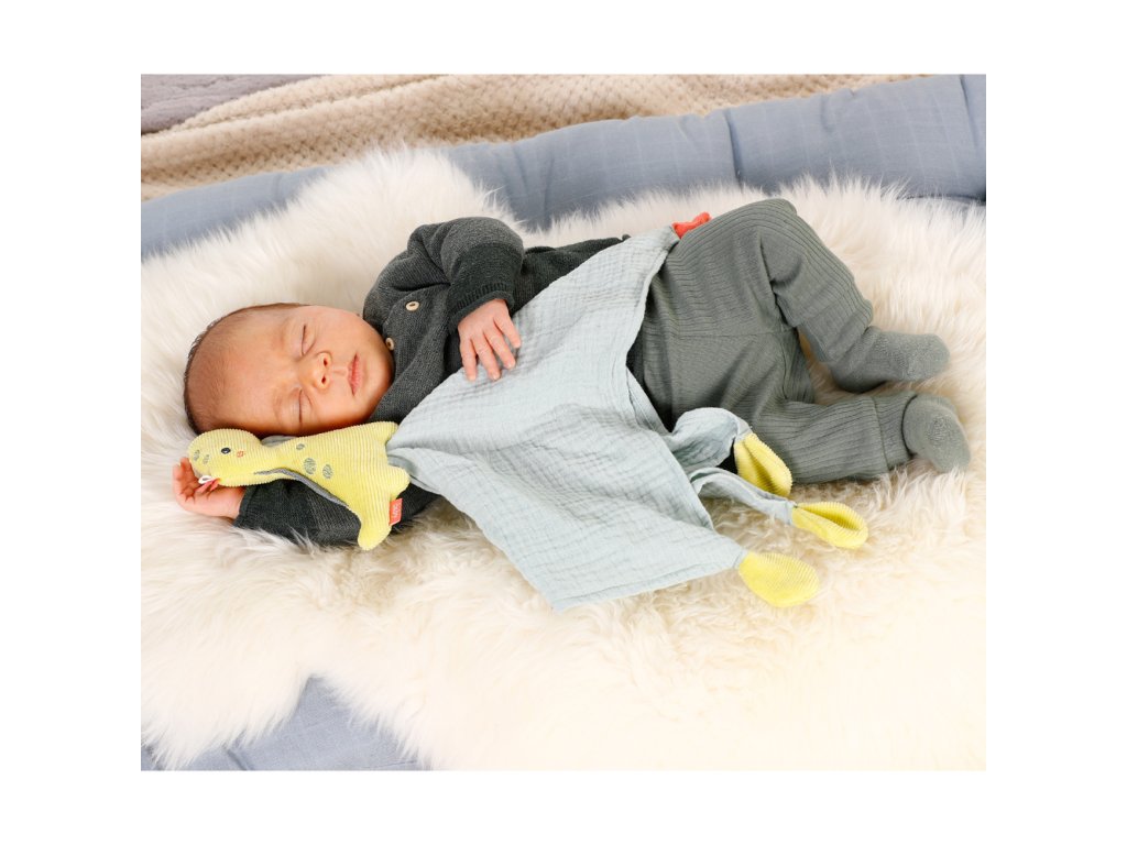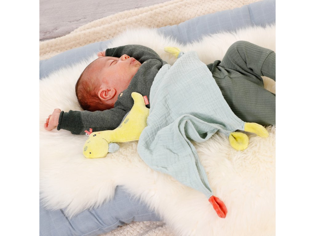 Mäkký plyšový zaspávač s dinosaurom vykúzli úsmev na tvári každého dieťaťa. Hračka poslúži ako ľahko prenositeľný kamarát na hranie počas dňa av noci sa premení na pomocníka pri zaspávaní. Mäkký kvalitný plyš v kombinácii s bavlneným mušelínom poskytuje komfort a pohodlie. Hračka rozvíja fantáziu a hmat aj u veľmi malých detí.