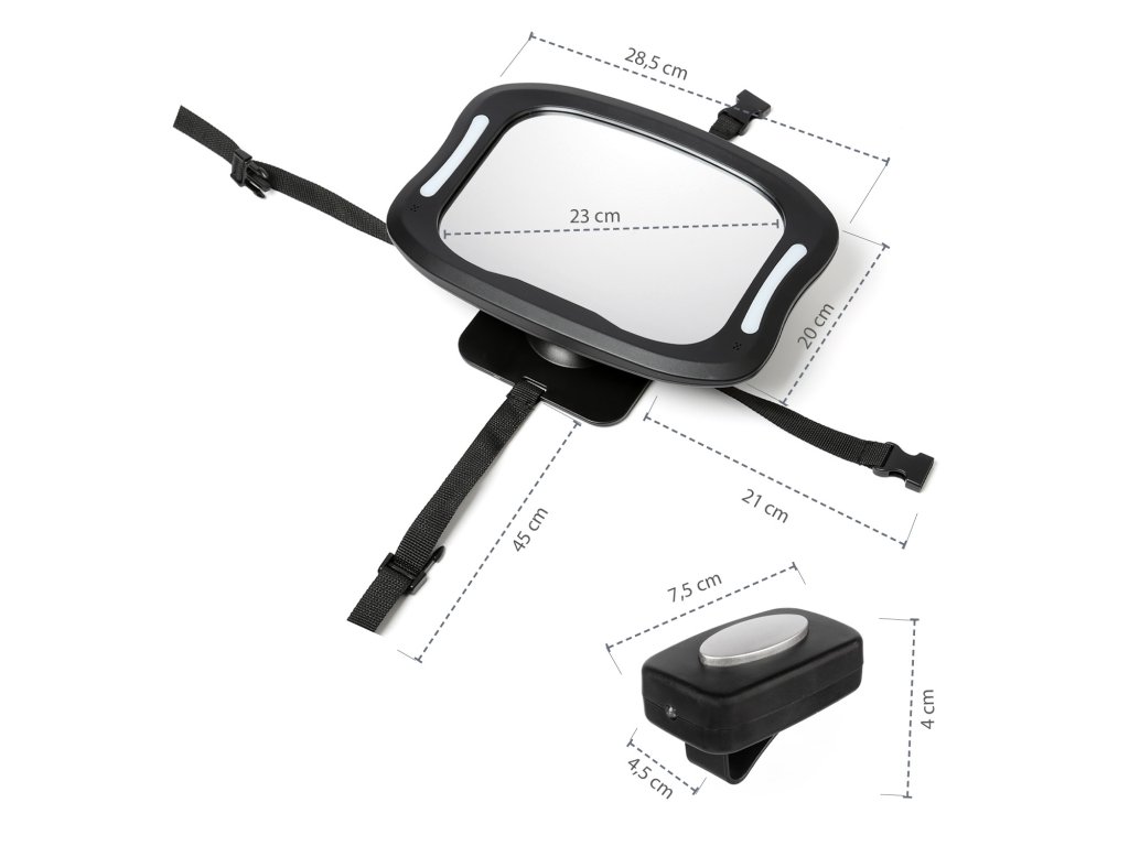 Sledujte svoje dieťa počas jazdy, a to aj v tme. Praktické zrkadlo s osvetlením LED vám umožní vidieť vaše dieťa aj pri slabom osvetlení. Zrkadlo je odolné proti rozbitiu a možno ho ľahko nainštalovať na opierky hlavy sedadla. Má dlhú životnosť batérií a možno ho ovládať diaľkovým ovládaním (zrkadlo 3× AA, diaľkové ovládanie - 2× AAA. Batérie nie sú súčasťou balenia.